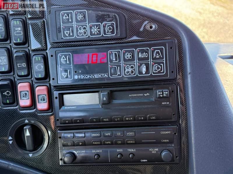 : klimatyzacja, video, lodówka, oświetlenie indywidualne, nawiewy dyszowe, podnóżki, stoliczki, siateczki, ABS, ASR, tempomat, retarder, CD, mikrofon, radio, fotele odchylane i rozsuwane, regulacja wysokości nadwozia, centralny zamek, podwójne szyby boczne, wspomaganie kierownicy, elektryczne lusterka, ogrzewanie stacjonarne, DVD