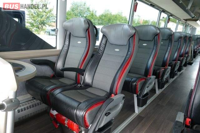 : video, WC, lodówka, caffebar, oświetlenie indywidualne, ABS, ASR, tempomat, retarder, CD, podnóżki, mikrofon, klimatyzacja, radio, regulacja wysokości nadwozia, centralny zamek, podwójne szyby boczne, wspomaganie kierownicy, elektryczne lusterka, fotele odchylane i rozsuwane, DVD, ogrzewanie stacjonarne, ESP