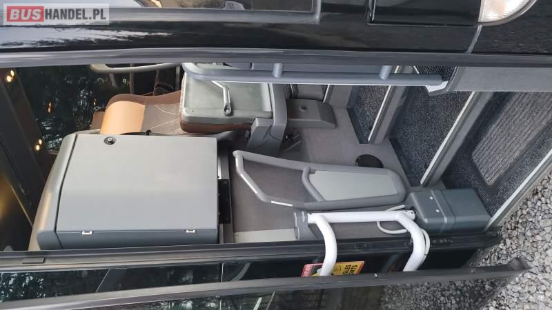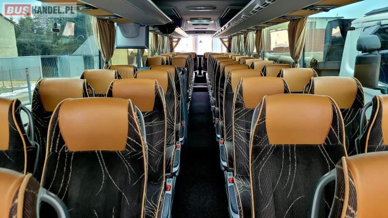 : klimatyzacja, video, WC, lodówka, caffebar, kabina sypialna, oświetlenie indywidualne, nawiewy dyszowe, fotele odchylane, podnóżki, stoliczki, siateczki, ABS, ASR, tempomat, retarder, nawigacja, CD, mikrofon, radio, fotele odchylane i rozsuwane, sejf, regulacja wysokości nadwozia, centralny zamek, podwójne szyby boczne, wspomaganie kierownicy, elektryczne lusterka, DVD, hak holowniczy, ESP