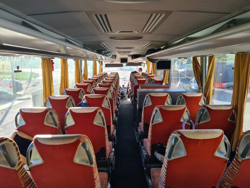 : WC, lodówka, kabina sypialna, oświetlenie indywidualne, ABS, ASR, tempomat, retarder, podnóżki, mikrofon, klimatyzacja, radio, regulacja wysokości nadwozia, podwójne szyby boczne, elektryczne lusterka, fotele odchylane i rozsuwane