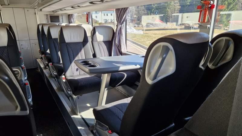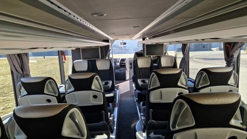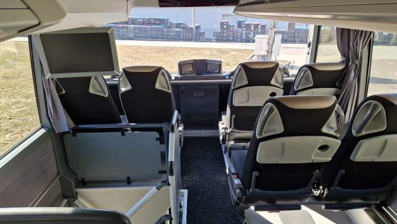 : video, WC, lodówka, caffebar, kabina sypialna, fotele odchylane, oświetlenie indywidualne, nawiewy dyszowe, siateczki, ABS, ASR, tempomat, retarder, CD, podnóżki, stoliczki, mikrofon, klimatyzacja, radio, kuchenka mikrofalowa, regulacja wysokości nadwozia, centralny zamek, podwójne szyby boczne, wspomaganie kierownicy, elektryczne lusterka, fotele odchylane i rozsuwane, DVD, ogrzewanie stacjonarne, hak holowniczy, ESP