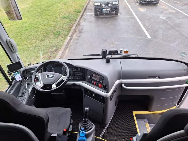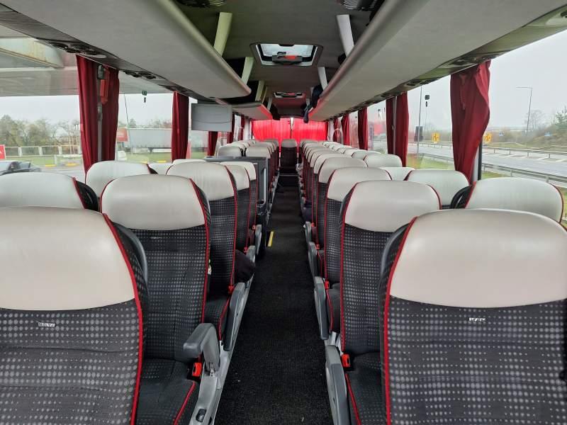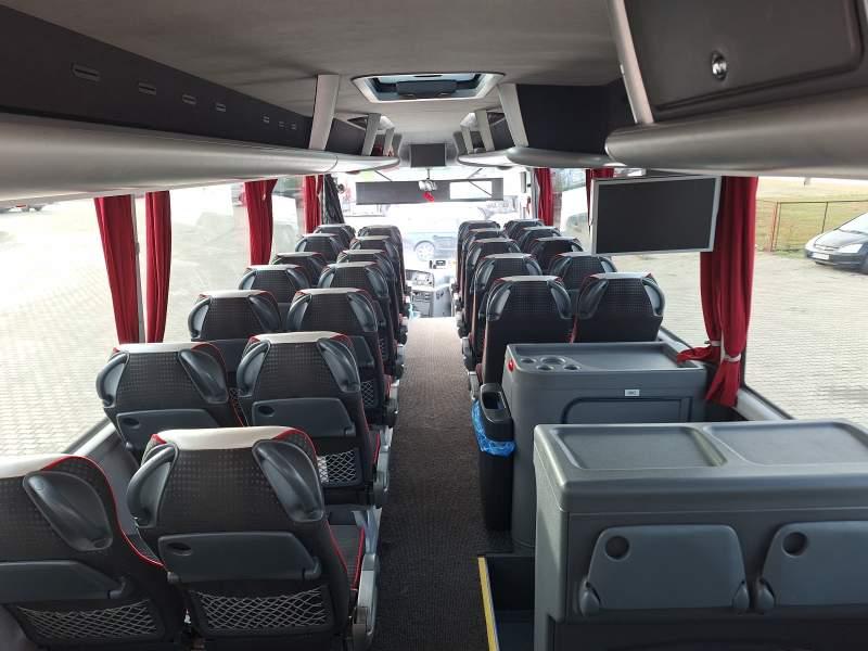 : klimatyzacja, video, WC, lodówka, caffebar, kabina sypialna, oświetlenie indywidualne, nawiewy dyszowe, podnóżki, stoliczki, siateczki, ABS, ASR, tempomat, retarder, telefon, nawigacja, CD, mikrofon, radio, fotele odchylane i rozsuwane, sejf, regulacja wysokości nadwozia, centralny zamek, podwójne szyby boczne, wspomaganie kierownicy, elektryczne lusterka, ogrzewanie stacjonarne, DVD, hak holowniczy, ESP