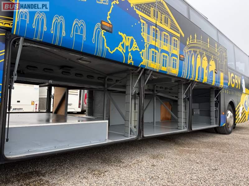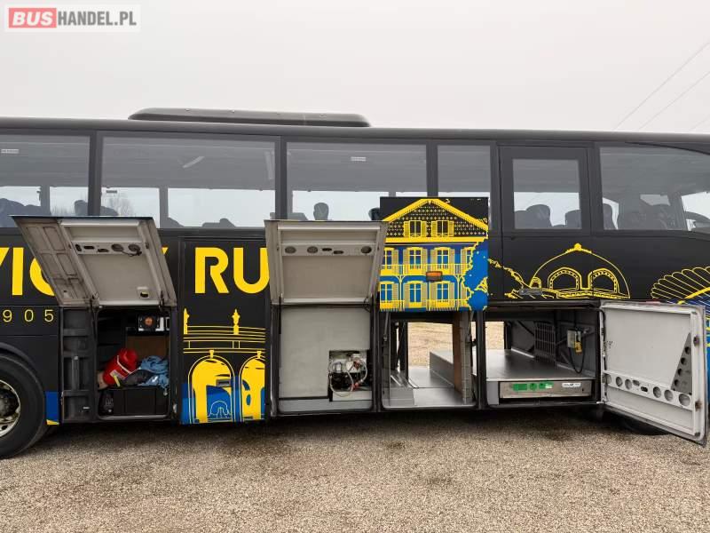 : video, WC, lodówka, caffebar, oświetlenie indywidualne, ABS, ASR, tempomat, retarder, CD, podnóżki, mikrofon, klimatyzacja, radio, rampa dla inwalidów, regulacja wysokości nadwozia, centralny zamek, podwójne szyby boczne, wspomaganie kierownicy, elektryczne lusterka, fotele odchylane i rozsuwane, DVD, ogrzewanie stacjonarne, ESP