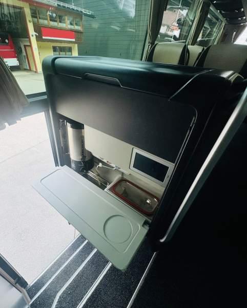: WC, lodówka, caffebar, oświetlenie indywidualne, nawiewy dyszowe, siateczki, ABS, ASR, tempomat, retarder, nawigacja, CD, podnóżki, stoliczki, mikrofon, klimatyzacja, radio, regulacja wysokości nadwozia, centralny zamek, podwójne szyby boczne, wspomaganie kierownicy, fotele odchylane i rozsuwane, DVD, ogrzewanie stacjonarne, ESP