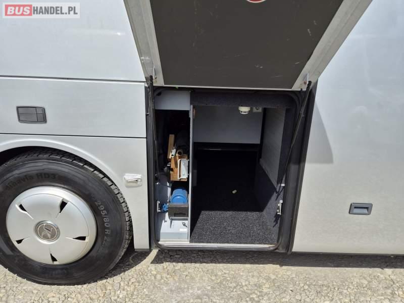 : video, WC, lodówka, caffebar, oświetlenie indywidualne, nawiewy dyszowe, siateczki, ABS, ASR, tempomat, retarder, nawigacja, CD, podnóżki, stoliczki, mikrofon, klimatyzacja, radio, regulacja wysokości nadwozia, centralny zamek, podwójne szyby boczne, wspomaganie kierownicy, elektryczne lusterka, fotele odchylane i rozsuwane, DVD, ogrzewanie stacjonarne, ESP