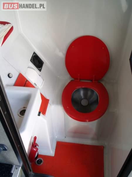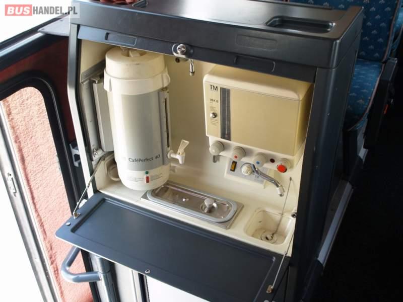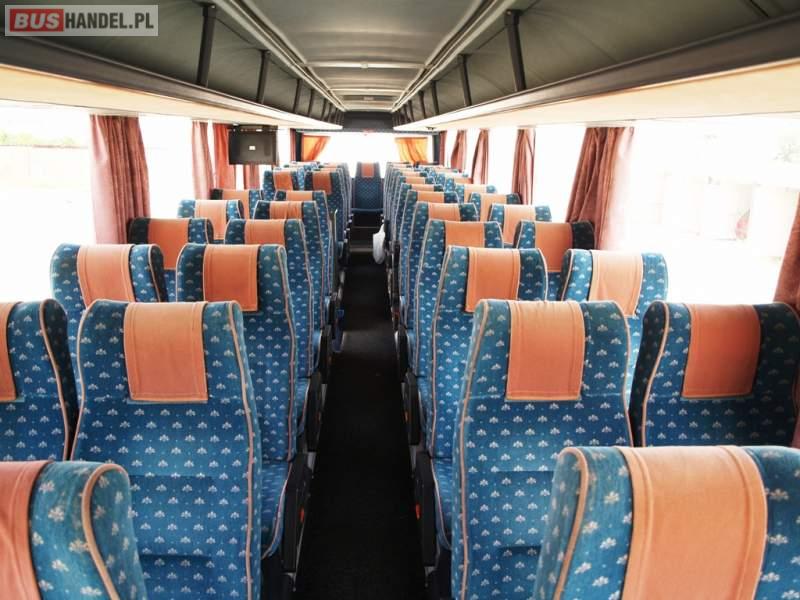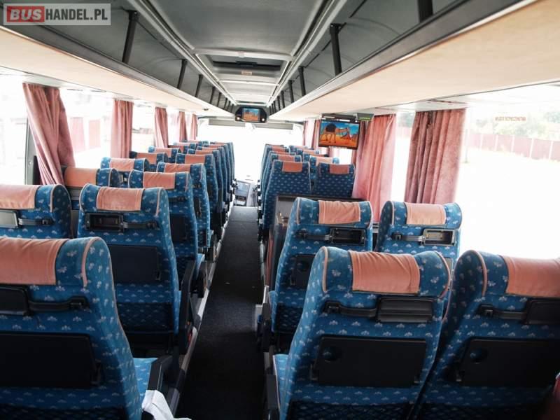 : video, WC, lodówka, caffebar, kabina sypialna, oświetlenie indywidualne, nawiewy dyszowe, siateczki, ABS, ASR, tempomat, retarder, telefon, CD, podnóżki, stoliczki, mikrofon, klimatyzacja, radio, podwójne szyby boczne, wspomaganie kierownicy, elektryczne lusterka, fotele odchylane i rozsuwane, DVD, ogrzewanie stacjonarne