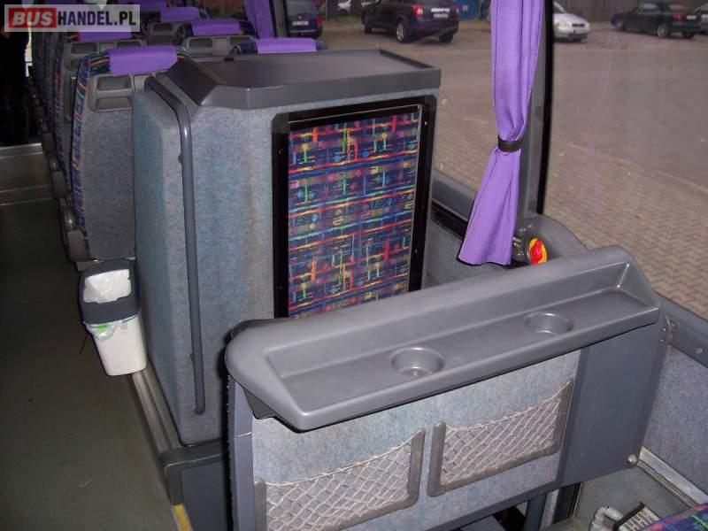 : video, WC, lodówka, caffebar, kabina sypialna, oświetlenie indywidualne, nawiewy dyszowe, siateczki, ABS, ASR, tempomat, retarder, CD, podnóżki, stoliczki, mikrofon, klimatyzacja, radio, regulacja wysokości nadwozia, centralny zamek, podwójne szyby boczne, wspomaganie kierownicy, elektryczne lusterka, fotele odchylane i rozsuwane, DVD, ogrzewanie stacjonarne, ESP