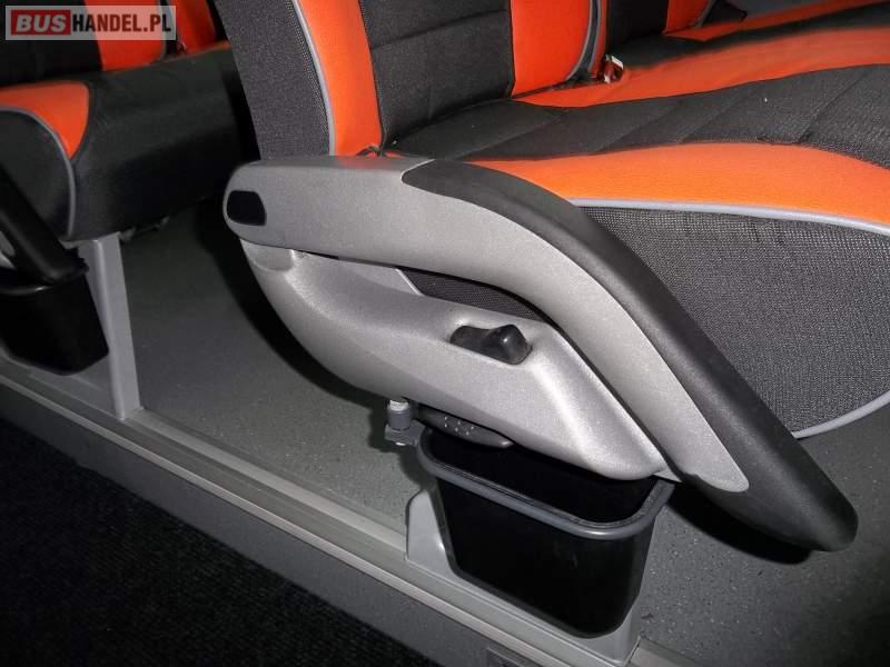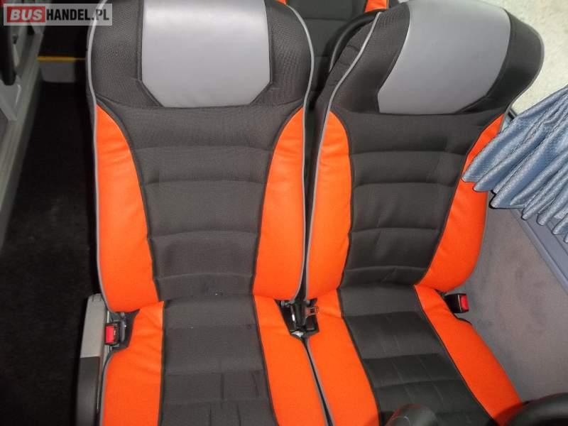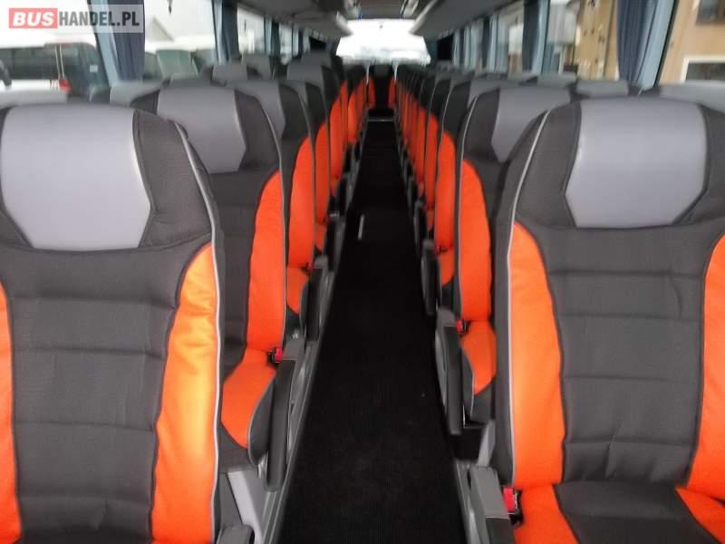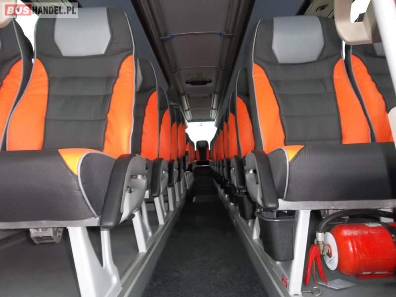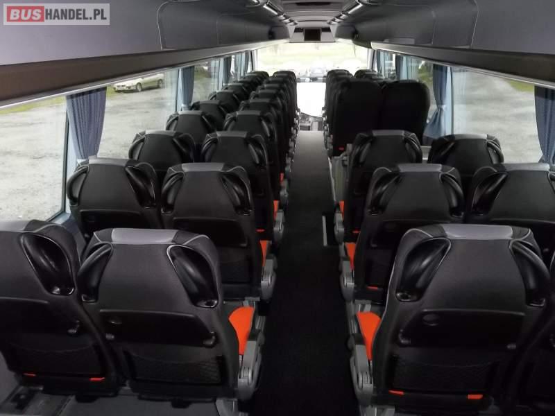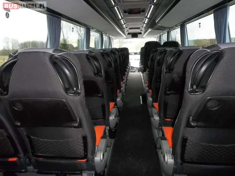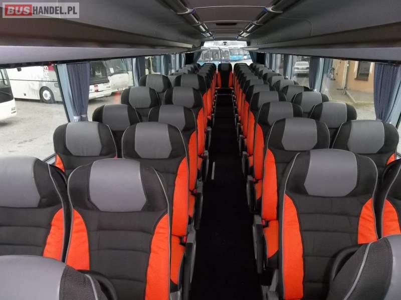 : video, WC, lodówka, caffebar, kabina sypialna, oświetlenie indywidualne, nawiewy dyszowe, siateczki, ABS, ASR, tempomat, retarder, telefon, nawigacja, CD, podnóżki, stoliczki, mikrofon, klimatyzacja, radio, sejf, regulacja wysokości nadwozia, centralny zamek, podwójne szyby boczne, wspomaganie kierownicy, elektryczne lusterka, fotele odchylane i rozsuwane, DVD, ogrzewanie stacjonarne, ESP