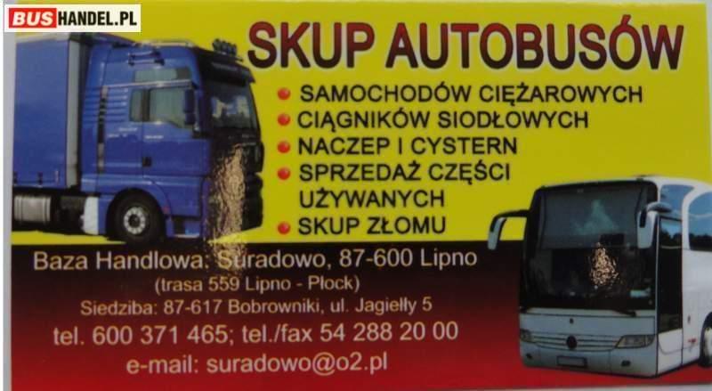 Witam! Firma zdecydowanie kupi autobusy wszystkich marek! Pojazdy mogą być uszkodzone, niekompletne, powypadkowe, bez ważnych dokumentów. Skupujemy również sprawne autobusy. Cena do uzgodnienia telefonicznie. Najlepsze CENY, płatność gotówką ! Odbiór 24 H. Posiadam również części do wszystkich marek autobusów! Pozdrawiam! 532556461. 600371465 , 504531059 Jesteśmy największą firmą w Polsce zajmującą się kasacją autobusów . http://skupzlomu-autobusow. pl/ Sprzedający: