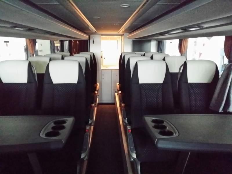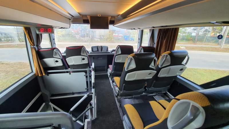 : video, WC, lodówka, caffebar, kabina sypialna, oświetlenie indywidualne, nawiewy dyszowe, siateczki, ABS, ASR, tempomat, retarder, telefon, CD, podnóżki, stoliczki, mikrofon, klimatyzacja, radio, kuchenka mikrofalowa, wyświetlacz matrix, sejf, regulacja wysokości nadwozia, centralny zamek, podwójne szyby boczne, wspomaganie kierownicy, elektryczne lusterka, fotele odchylane i rozsuwane, DVD, ogrzewanie stacjonarne, hak holowniczy, ESP