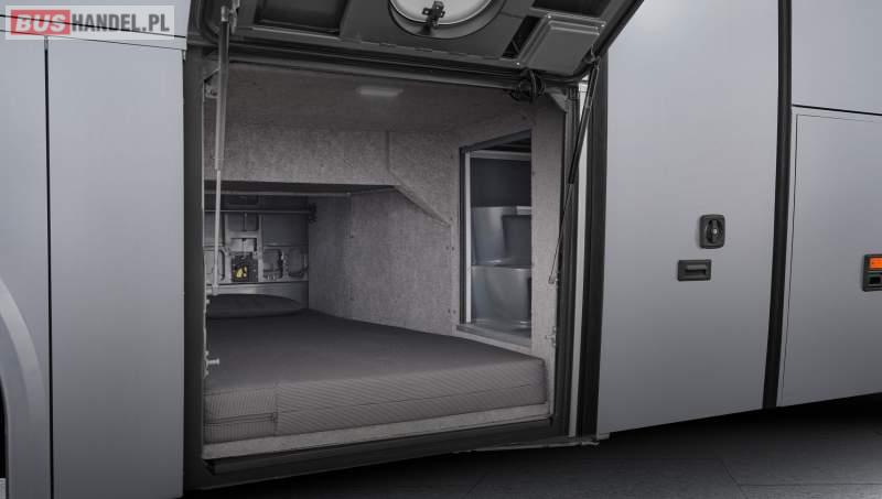 : video, WC, lodówka, kabina sypialna, oświetlenie indywidualne, nawiewy dyszowe, siateczki, ABS, ASR, tempomat, retarder, telefon, CD, podnóżki, stoliczki, mikrofon, klimatyzacja, radio, regulacja wysokości nadwozia, centralny zamek, podwójne szyby boczne, wspomaganie kierownicy, elektryczne lusterka, fotele odchylane i rozsuwane, DVD, ogrzewanie stacjonarne, ESP