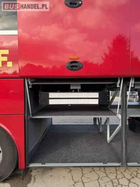 : klimatyzacja, WC, lodówka, kabina sypialna, oświetlenie indywidualne, nawiewy dyszowe, podnóżki, stoliczki, siateczki, ABS, ASR, tempomat, retarder, mikrofon, fotele odchylane i rozsuwane, rampa dla inwalidów, sejf, regulacja wysokości nadwozia, centralny zamek, podwójne szyby boczne, wspomaganie kierownicy, elektryczne lusterka, ogrzewanie stacjonarne, ESP