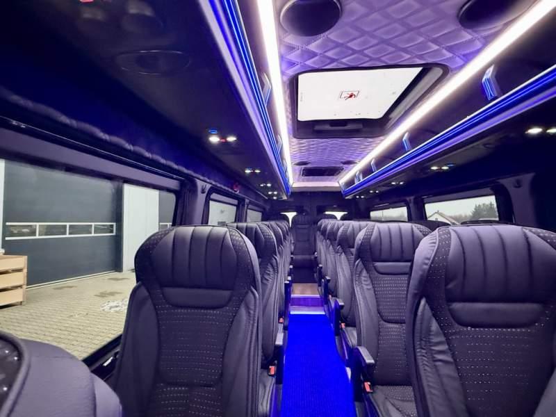 Fabrycznie nowy autobus Autobus dostępny od zaraz ! Nr. Oferty: 511 Mercedes-Benz Elegantbus Sprinter 519 EURO VI E GSR II 22+1+1 miejsc siedzących z możliwością szybkiej zmiany na 19+1+1 miejsc siedzących i zwiększenia przestrzeni bagażowej ! Wersja XXXL o długości 7, 87 m Pojemność: 1950 cm3 Pakiet stylistyczny Moc: 190 KM Rok produkcji: 2025 Kolor: Czarny Obsidian Metalik PODSTAWOWE I DODATKOWE WYPOSAŻENIE BAZOWE – ABS, SRS, ESP – Wspomaganie kierownicy – Automatyczna 9 stopniowa skrzynia biegów – Centralny zamek, immobiliser – Reflektory przednie w technologii LED – Tylne lampy częściowo w technologii LED – Asystent utrzymania pasa ruchu – Tempo 100 km/h – Elektryczne szyby – Sensor świateł oraz deszczu – Tempomat – Kierownica wielofunkcyjna, trójramienna – Stabilizacja poziom II – Wzmocnione opony 205/75/R16C – Dogrzewacz elektryczny PTC – Klimatyzacja półautomatyczna TEMPTRONIC – Fotel kierowcy komfortowy z podłokietnikiem – Światła z funkcją świateł do jazdy dziennej – Lusterko wsteczne – Asystent pasa ruchu – Zamykany schowek na kokpicie – Akumulator AGM 12V 95 Ah – Lusterko wsteczne wewnętrzne – Zbiornik paliwa powiększony: 93 litry – Chlapacze przednie – Chlapacze tylnie – Drugi akumulator w komorze silnika – Nawigacja satelitarna – Apple Car Play - Android Auto FOTELE PRZEDZIAŁU PASAŻERSKIEGO – Komfortowe turystyczne fotele przedziału pasażerskiego (regulacja oparcia oraz przesuw boczny) – Fotele posiadają pasy bezpieczeństwa, podłokietniki, siateczki, stoliki, rączki, komfortowe zagłówki, – Fotele montowane na podestach – Fotel pilota na słupku B PRZESZKLENIE POJAZDU – Szyby podwójne, przyciemniane fabrycznie – Firanki przeciwsłoneczne na prowadnicach – Szyby drzwi elektrycznych podgrzewane SYSTEMY GRZEWCZE – Grzejniki konwektorowe wodne zainstalowane w przedziale pasażerskim po lewej i prawej stronie – Postojowe ogrzewanie wodne, oryginalne EBERSCHPRECHER 5 kW KLIMATYZACJA – Automatyczna Klimatyzacja dachowa WEBASTO 12, 5 kW OŚWIETLENIE – Oświetlenie indywidualne – Oświetlenie postojowe – Oświetlenie nocne – Podświetlane stopnie wejściowe – Podesty z podświetleniem LED – Lampy obrysowe dachowe LED MULTIMEDIA – System multimedialny MBUX 10, 5 cala – Oryginalna Kamera Cofania – Mikrofon – Nagłośnienie przestrzeni pasażerskiej PIONNER – Gniazda USB dla każdego rzędu siedzeń – Przetwornica 230v PRZECHOWYWANIE BAGAŻU I UBRAŃ – Turystyczne półki bagażowe – Lodówka o pojemności 40 litrów – Pogłębiony tylny bagażnik – Wieszaki ubraniowe ELEMENTY BEZPIECZEŃSTWA – Podłoga antypoślizgowa PCV, odporna na ścieranie, wodoodporna – Szyberdach wentylacyjny / wyjście awaryjne – Młotki bezpieczeństwa – Dodatkowa gaśnica 2 kg ELEMENTY FUNKCJONALNE – Elektryczne drzwi wejściowe sterowane z przycisku i pilota – Podwójny stopień wejściowy oświetlony LED – Przedłużenie pojazdu w tylnej części – Hak holowniczy LIFTING ZEWNĘTRZNY – Lakierowane zderzaki, listwy, klamki, lusterka i grill w kolorze pojazdu – Spojlery dolne w kolorze nadwozia Sprzedający: