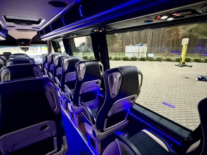 Fabrycznie nowy autobus Autobus dostępny od zaraz ! Nr. oferty: 897 Mercedes-Benz Elegantbus Sprinter 519 EURO VI E GSR II 22+1+1 miejsc siedzących z możliwością szybkiej zmiany na 19+1+1 miejsc siedzących i zwiększenia przestrzeni bagażowej ! Full Panorama Relingi dachowe Wersja XXXL o długości 7, 87 m Pojemność: 1950 cm3 Pakiet stylistyczny Moc: 190 KM Rok produkcji: 2025 Kolor: Czarny Obsidian Metalik PODSTAWOWE I DODATKOWE WYPOSAŻENIE BAZOWE – ABS, SRS, ESP – Wspomaganie kierownicy – Automatyczna 9 stopniowa skrzynia biegów – Centralny zamek, immobiliser – Reflektory przednie w technologii LED – Światła przeciwmgłowe przednie z funkcja doświetlania zakrętów – Tylne lampy częściowo w technologii LED – Asystent utrzymania pasa ruchu – Tempo 100 km/h – Elektryczne szyby – Sensor świateł oraz deszczu – Tempomat – Kierownica wielofunkcyjna, trójramienna – Stabilizacja poziom II – Wzmocnione opony 205/75/R16C – Dogrzewacz elektryczny PTC – Klimatyzacja półautomatyczna TEMPTRONIC – Fotel kierowcy komfortowy z podłokietnikiem – Światła z funkcją świateł do jazdy dziennej – Lusterko wsteczne – Asystent pasa ruchu – Zamykany schowek na kokpicie – Akumulator AGM 12V 95 Ah – Lusterko wsteczne wewnętrzne – Zbiornik paliwa powiększony: 93 litry – Chlapacze przednie – Chlapacze tylnie – Drugi akumulator w komorze silnika – Nawigacja satelitarna – Apple Car Play - Android Auto FOTELE PRZEDZIAŁU PASAŻERSKIEGO – Komfortowe turystyczne fotele przedziału pasażerskiego (regulacja oparcia oraz przesuw boczny) w kolorze jasno brązowym – Fotele posiadają pasy bezpieczeństwa, podłokietniki, siateczki, stoliki, rączki, komfortowe zagłówki, – Fotele montowane na podestach – Fotel pilota na słupku B PRZESZKLENIE POJAZDU – Szyby boczne panoramiczne – Szyby podwójne, przyciemniane fabrycznie – Firanki przeciwsłoneczne na prowadnicach – Szyby drzwi elektrycznych podgrzewane SYSTEMY GRZEWCZE – Grzejniki konwektorowe wodne zainstalowane w przedziale pasażerskim po lewej i prawej stronie – Postojowe ogrzewanie wodne, oryginalne EBERSCHPRECHER 5 kW KLIMATYZACJA – Automatyczna Klimatyzacja dachowa WEBASTO 12, 5 kW OŚWIETLENIE – Oświetlenie indywidualne – Oświetlenie postojowe – Oświetlenie nocne – Podświetlane stopnie wejściowe – Podesty z podświetleniem LED – Lampy obrysowe dachowe LED – Dodatkowe oświetlenie ambientowe na bokach pojazdu w listach imitacja mahoń MULTIMEDIA – System multimedialny MBUX 10, 5 cala – Oryginalna Kamera Cofania – Mikrofon – Nagłośnienie przestrzeni pasażerskiej PIONNER – Gniazda USB dla każdego rzędu siedzeń – Przetwornica 230v PRZECHOWYWANIE BAGAŻU I UBRAŃ – Turystyczne półki bagażowe – Lodówka o pojemności 40 litrów – Pogłębiony tylny bagażnik – Wieszaki ubraniowe ELEMENTY BEZPIECZEŃSTWA – Podłoga antypoślizgowa PCV, odporna na ścieranie, wodoodporna – Szyberdach wentylacyjny / wyjście awaryjne – Młotki bezpieczeństwa – Dodatkowa gaśnica 2 kg ELEMENTY FUNKCJONALNE – Elektryczne drzwi wejściowe – Dodatkowe sterowanie drzwi elektrycznych z pilota – Podwójny stopień wejściowy oświetlony LED – Przedłużenie pojazdu w tylnej części – Hak holowniczy LIFTING ZEWNĘTRZNY – Lakierowane zderzaki, listwy, klamki, lusterka i grill w kolorze pojazdu – Spojlery dolne w kolorze nadwozia – Relingi dachowe Sprzedający: