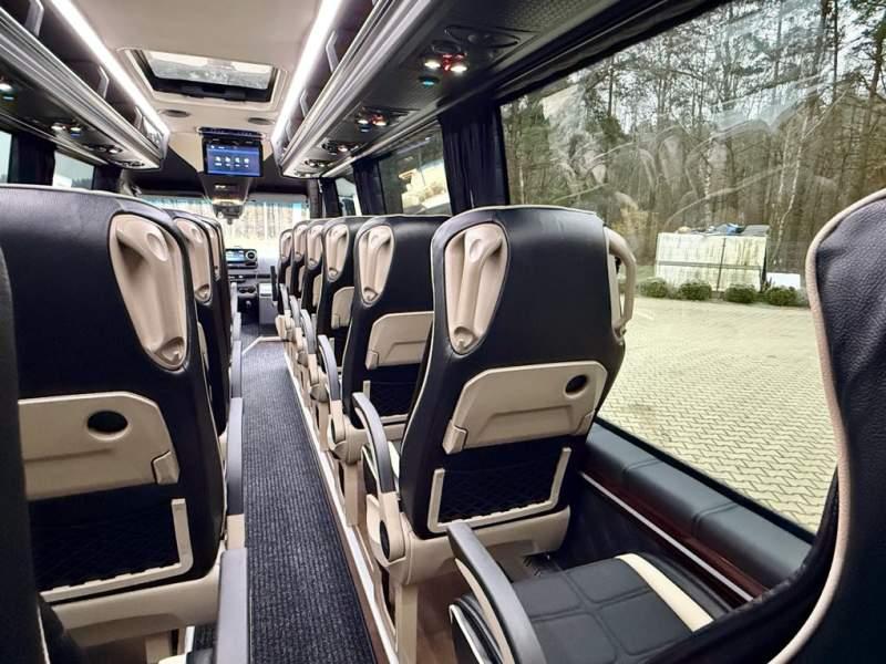 Fabrycznie nowy autobus Autobus dostępny od zaraz ! Nr. oferty: 897 Mercedes-Benz Elegantbus Sprinter 519 EURO VI E GSR II 22+1+1 miejsc siedzących z możliwością szybkiej zmiany na 19+1+1 miejsc siedzących i zwiększenia przestrzeni bagażowej ! Full Panorama Relingi dachowe Wersja XXXL o długości 7, 87 m Pojemność: 1950 cm3 Pakiet stylistyczny Moc: 190 KM Rok produkcji: 2025 Kolor: Czarny Obsidian Metalik PODSTAWOWE I DODATKOWE WYPOSAŻENIE BAZOWE – ABS, SRS, ESP – Wspomaganie kierownicy – Automatyczna 9 stopniowa skrzynia biegów – Centralny zamek, immobiliser – Reflektory przednie w technologii LED – Światła przeciwmgłowe przednie z funkcja doświetlania zakrętów – Tylne lampy częściowo w technologii LED – Asystent utrzymania pasa ruchu – Tempo 100 km/h – Elektryczne szyby – Sensor świateł oraz deszczu – Tempomat – Kierownica wielofunkcyjna, trójramienna – Stabilizacja poziom II – Wzmocnione opony 205/75/R16C – Dogrzewacz elektryczny PTC – Klimatyzacja półautomatyczna TEMPTRONIC – Fotel kierowcy komfortowy z podłokietnikiem – Światła z funkcją świateł do jazdy dziennej – Lusterko wsteczne – Asystent pasa ruchu – Zamykany schowek na kokpicie – Akumulator AGM 12V 95 Ah – Lusterko wsteczne wewnętrzne – Zbiornik paliwa powiększony: 93 litry – Chlapacze przednie – Chlapacze tylnie – Drugi akumulator w komorze silnika – Nawigacja satelitarna – Apple Car Play - Android Auto FOTELE PRZEDZIAŁU PASAŻERSKIEGO – Komfortowe turystyczne fotele przedziału pasażerskiego (regulacja oparcia oraz przesuw boczny) w kolorze jasno brązowym – Fotele posiadają pasy bezpieczeństwa, podłokietniki, siateczki, stoliki, rączki, komfortowe zagłówki, – Fotele montowane na podestach – Fotel pilota na słupku B PRZESZKLENIE POJAZDU – Szyby boczne panoramiczne – Szyby podwójne, przyciemniane fabrycznie – Firanki przeciwsłoneczne na prowadnicach – Szyby drzwi elektrycznych podgrzewane SYSTEMY GRZEWCZE – Grzejniki konwektorowe wodne zainstalowane w przedziale pasażerskim po lewej i prawej stronie – Postojowe ogrzewanie wodne, oryginalne EBERSCHPRECHER 5 kW KLIMATYZACJA – Automatyczna Klimatyzacja dachowa WEBASTO 12, 5 kW OŚWIETLENIE – Oświetlenie indywidualne – Oświetlenie postojowe – Oświetlenie nocne – Podświetlane stopnie wejściowe – Podesty z podświetleniem LED – Lampy obrysowe dachowe LED – Dodatkowe oświetlenie ambientowe na bokach pojazdu w listach imitacja mahoń MULTIMEDIA – System multimedialny MBUX 10, 5 cala – Oryginalna Kamera Cofania – Mikrofon – Nagłośnienie przestrzeni pasażerskiej PIONNER – Gniazda USB dla każdego rzędu siedzeń – Przetwornica 230v PRZECHOWYWANIE BAGAŻU I UBRAŃ – Turystyczne półki bagażowe – Lodówka o pojemności 40 litrów – Pogłębiony tylny bagażnik – Wieszaki ubraniowe ELEMENTY BEZPIECZEŃSTWA – Podłoga antypoślizgowa PCV, odporna na ścieranie, wodoodporna – Szyberdach wentylacyjny / wyjście awaryjne – Młotki bezpieczeństwa – Dodatkowa gaśnica 2 kg ELEMENTY FUNKCJONALNE – Elektryczne drzwi wejściowe – Dodatkowe sterowanie drzwi elektrycznych z pilota – Podwójny stopień wejściowy oświetlony LED – Przedłużenie pojazdu w tylnej części – Hak holowniczy LIFTING ZEWNĘTRZNY – Lakierowane zderzaki, listwy, klamki, lusterka i grill w kolorze pojazdu – Spojlery dolne w kolorze nadwozia – Relingi dachowe Sprzedający: