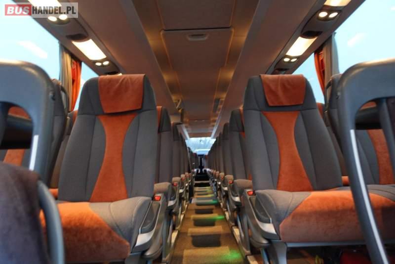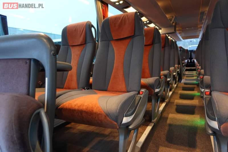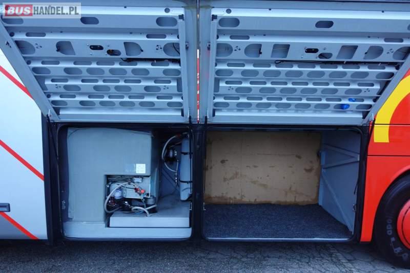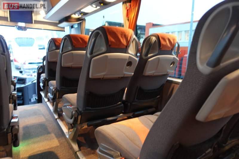 : video, WC, lodówka, caffebar, kabina sypialna, fotele odchylane, oświetlenie indywidualne, nawiewy dyszowe, siateczki, ABS, ASR, tempomat, retarder, nawigacja, CD, podnóżki, stoliczki, klimatyzacja, radio, wyświetlacz matrix, regulacja wysokości nadwozia, centralny zamek, podwójne szyby boczne, wspomaganie kierownicy, elektryczne lusterka, fotele odchylane i rozsuwane, DVD, ogrzewanie stacjonarne, hak holowniczy, ESP