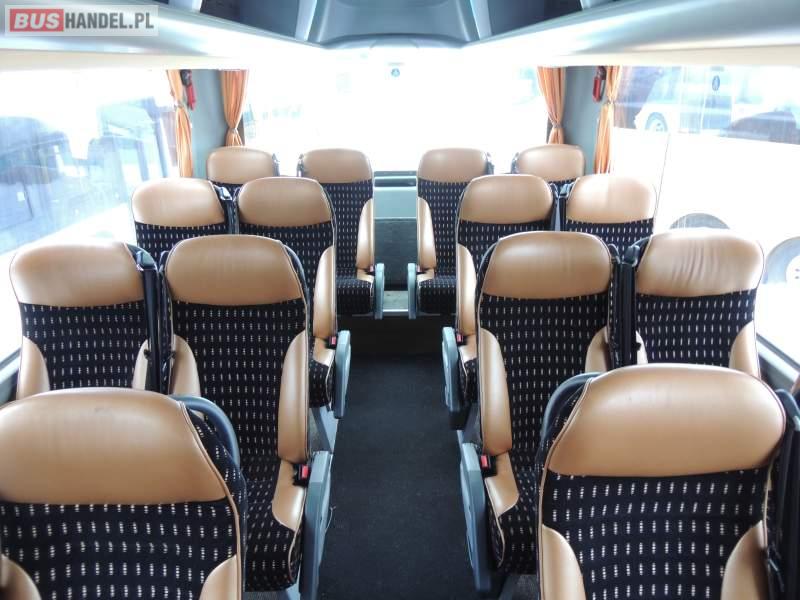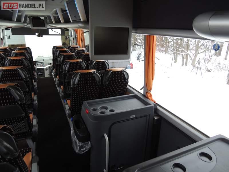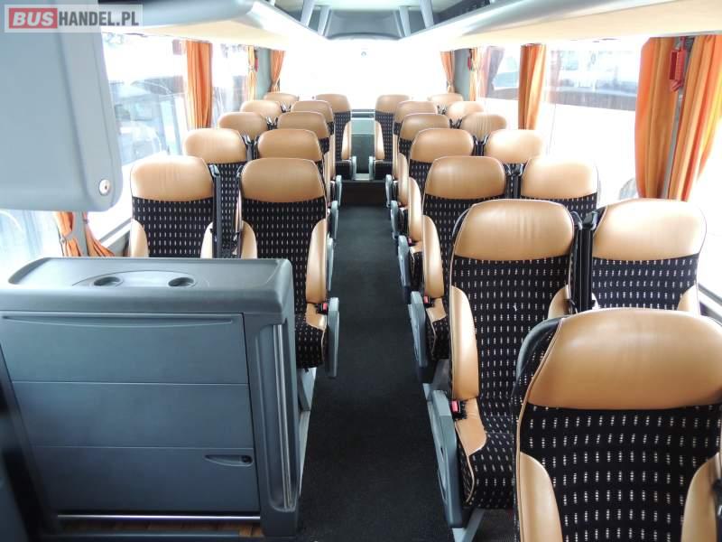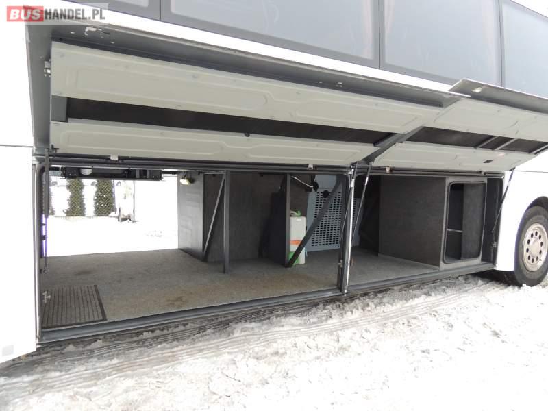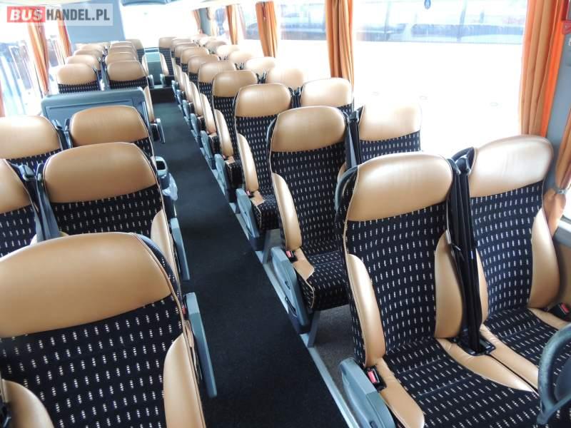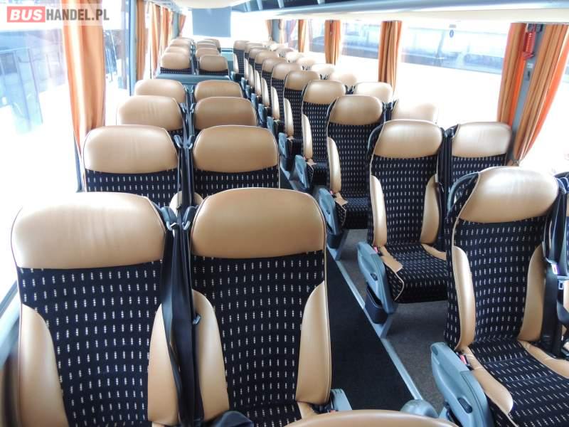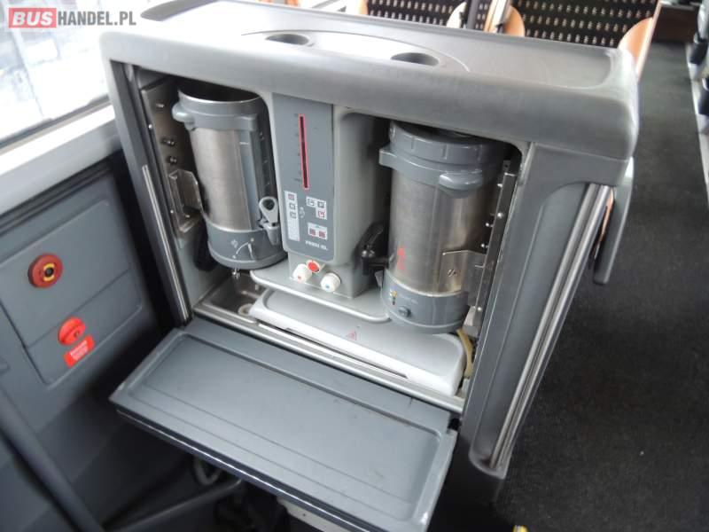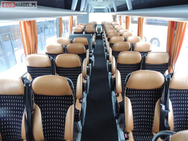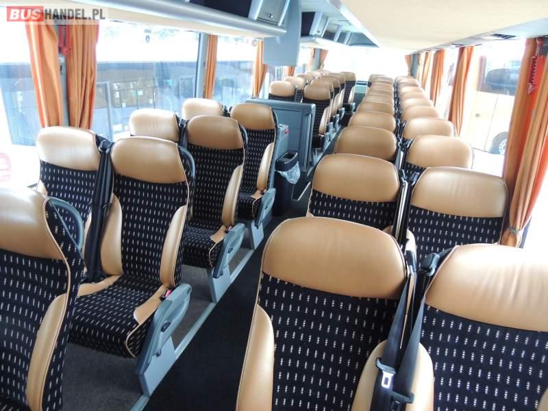 : video, WC, lodówka, caffebar, kabina sypialna, oświetlenie indywidualne, nawiewy dyszowe, siateczki, ABS, ASR, tempomat, retarder, nawigacja, CD, podnóżki, stoliczki, mikrofon, klimatyzacja, radio, sejf, regulacja wysokości nadwozia, centralny zamek, podwójne szyby boczne, wspomaganie kierownicy, elektryczne lusterka, fotele odchylane i rozsuwane, DVD, ogrzewanie stacjonarne, hak holowniczy, ESP