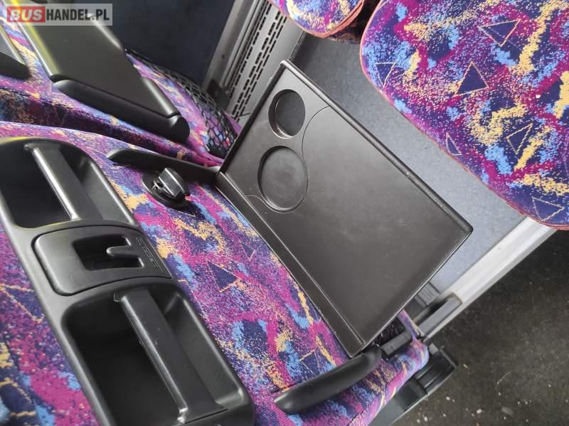 : video, WC, lodówka, caffebar, kabina sypialna, fotele odchylane, oświetlenie indywidualne, nawiewy dyszowe, siateczki, ABS, ASR, tempomat, retarder, telefon, nawigacja, CD, podnóżki, stoliczki, mikrofon, klimatyzacja, radio, sejf, regulacja wysokości nadwozia, centralny zamek, podwójne szyby boczne, wspomaganie kierownicy, elektryczne lusterka, fotele odchylane i rozsuwane, DVD, ogrzewanie stacjonarne, ESP