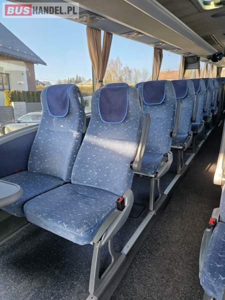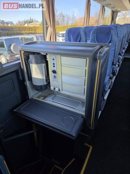 : lodówka, caffebar, oświetlenie indywidualne, nawiewy dyszowe, siateczki, ABS, ASR, tempomat, retarder, podnóżki, stoliczki, mikrofon, klimatyzacja, radio, sejf, centralny zamek, podwójne szyby boczne, wspomaganie kierownicy, elektryczne lusterka, fotele odchylane i rozsuwane, ogrzewanie stacjonarne, ESP