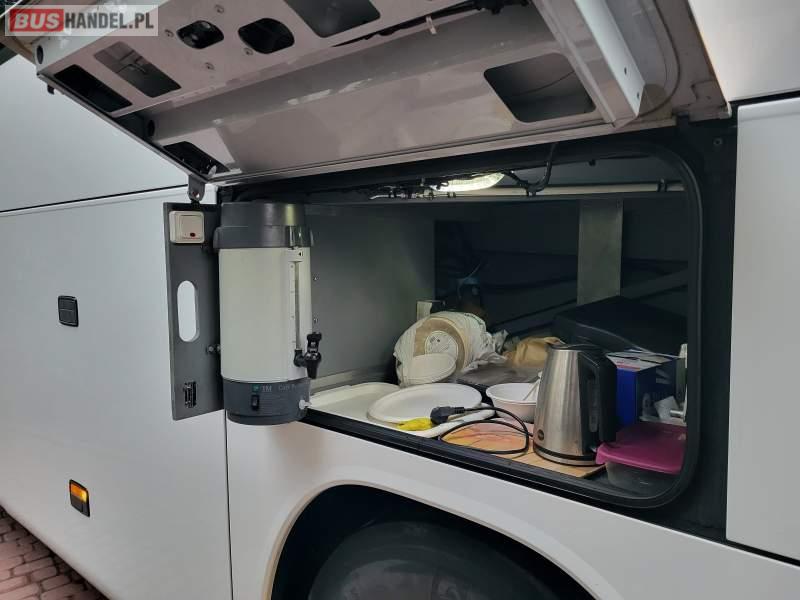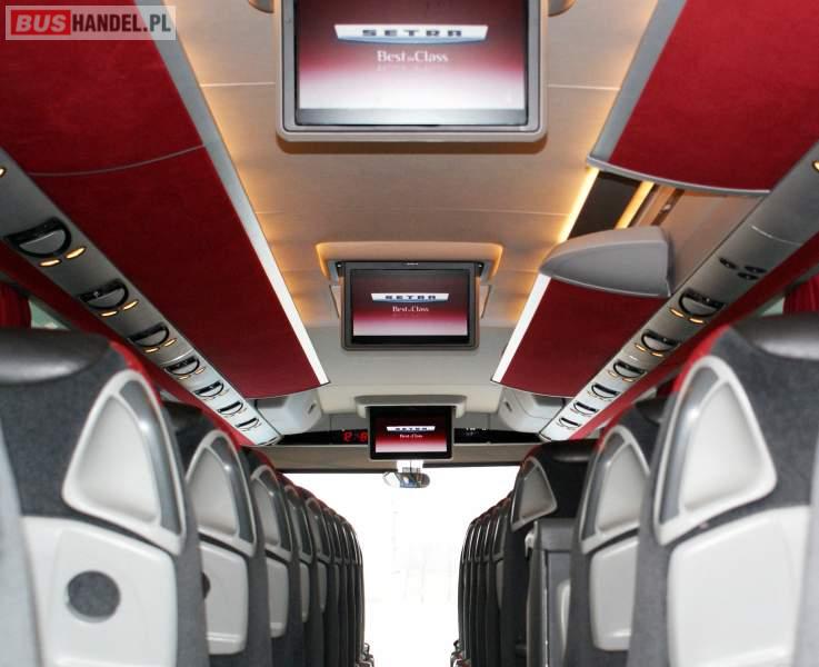 : klimatyzacja, video, WC, lodówka, caffebar, kabina sypialna, oświetlenie indywidualne, nawiewy dyszowe, podnóżki, stoliczki, siateczki, ABS, ASR, tempomat, retarder, telefon, nawigacja, CD, mikrofon, radio, fotele odchylane i rozsuwane, sejf, regulacja wysokości nadwozia, centralny zamek, podwójne szyby boczne, wspomaganie kierownicy, elektryczne lusterka, ogrzewanie stacjonarne, DVD, hak holowniczy, ESP