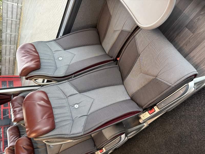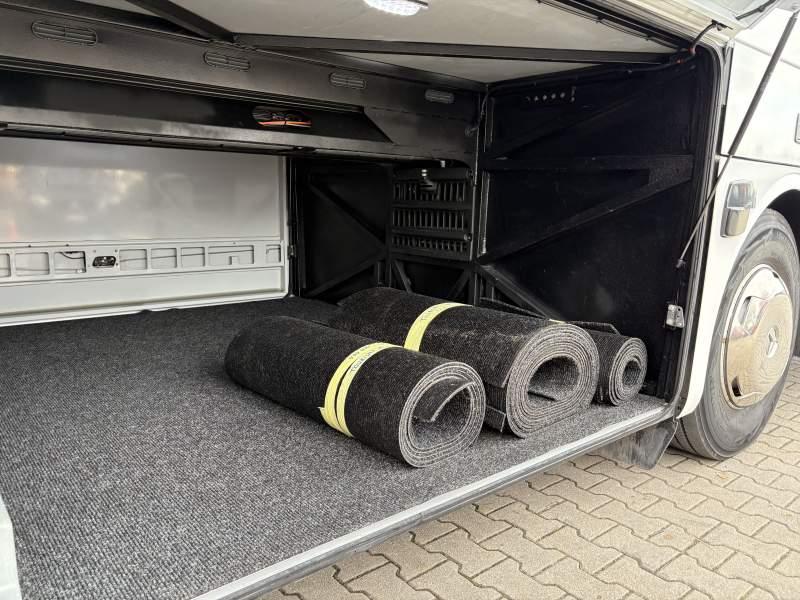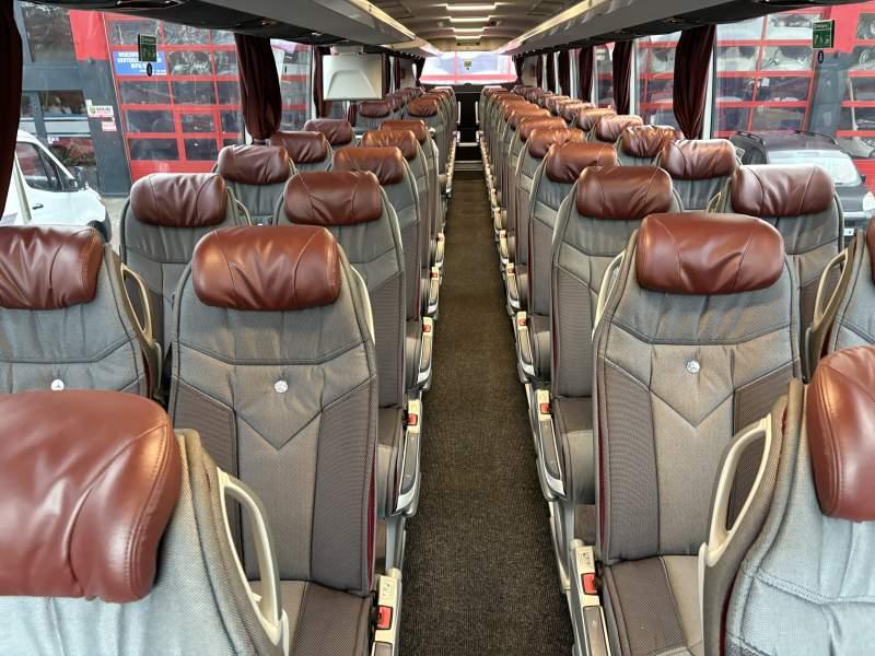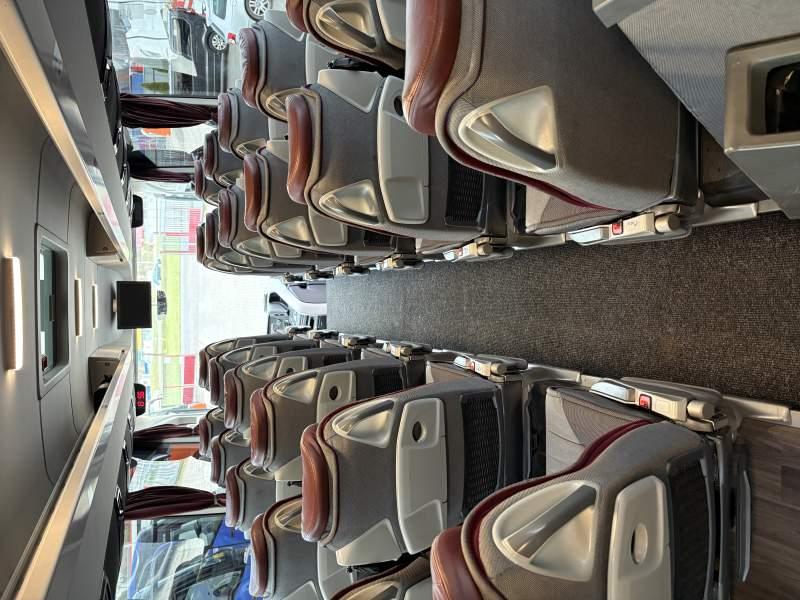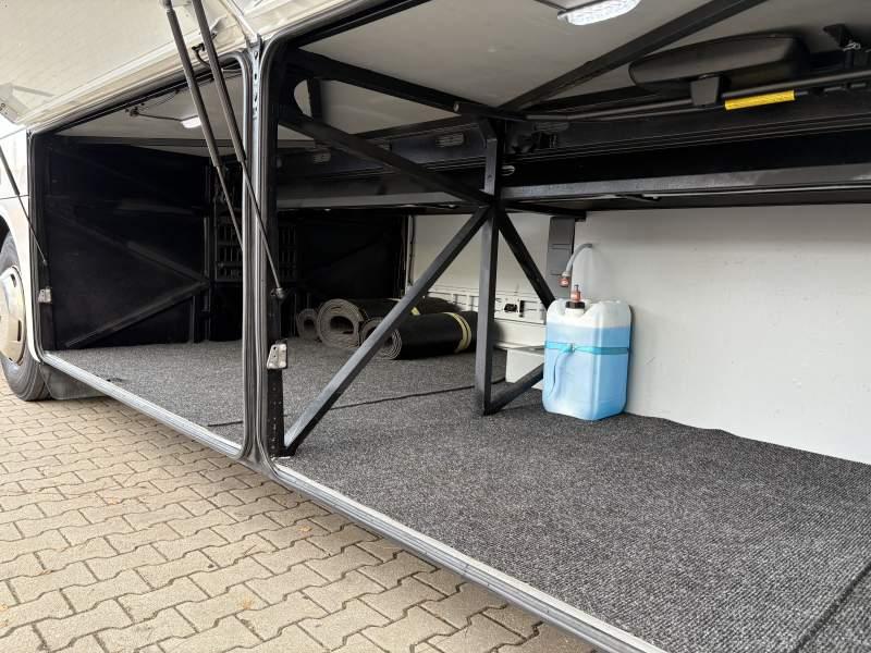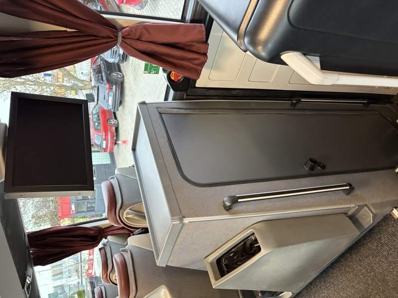 : video, WC, lodówka, caffebar, fotele odchylane, oświetlenie indywidualne, ABS, ASR, tempomat, retarder, nawigacja, CD, podnóżki, mikrofon, radio, sejf, centralny zamek, elektryczne lusterka, aluminiowe felgi, hak holowniczy
