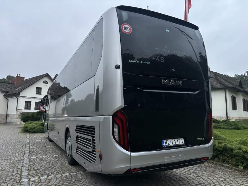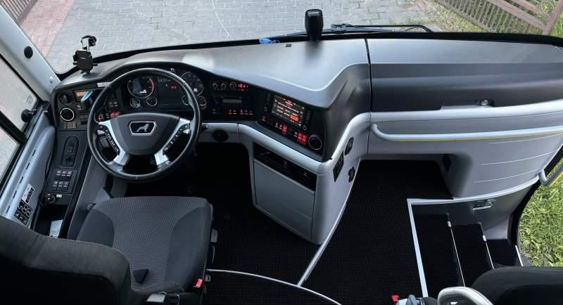 : WC, lodówka, caffebar, kabina sypialna, oświetlenie indywidualne, nawiewy dyszowe, siateczki, ABS, ASR, tempomat, retarder, nawigacja, CD, podnóżki, stoliczki, mikrofon, klimatyzacja, radio, regulacja wysokości nadwozia, centralny zamek, podwójne szyby boczne, wspomaganie kierownicy, elektryczne lusterka, fotele odchylane i rozsuwane, DVD, ogrzewanie stacjonarne, ESP