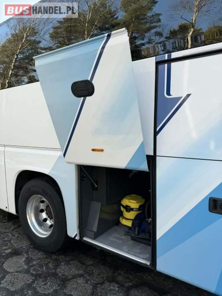: klimatyzacja, video, WC, lodówka, caffebar, kabina sypialna, oświetlenie indywidualne, nawiewy dyszowe, fotele odchylane, podnóżki, stoliczki, siateczki, ABS, ASR, tempomat, retarder, CD, mikrofon, radio, fotele odchylane i rozsuwane, regulacja wysokości nadwozia, podwójne szyby boczne, wspomaganie kierownicy, aluminiowe felgi, elektryczne lusterka, ogrzewanie stacjonarne, DVD, hak holowniczy, ESP