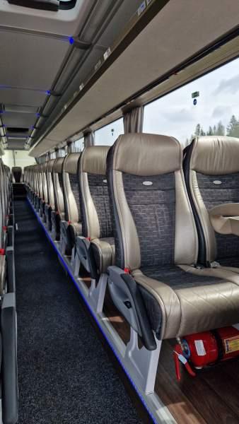 : video, WC, lodówka, caffebar, kabina sypialna, fotele odchylane, oświetlenie indywidualne, nawiewy dyszowe, siateczki, ABS, ASR, tempomat, retarder, telefon, nawigacja, CD, podnóżki, stoliczki, mikrofon, klimatyzacja, radio, regulacja wysokości nadwozia, centralny zamek, podwójne szyby boczne, wspomaganie kierownicy, elektryczne lusterka, fotele odchylane i rozsuwane, DVD, ogrzewanie stacjonarne, hak holowniczy, ESP
