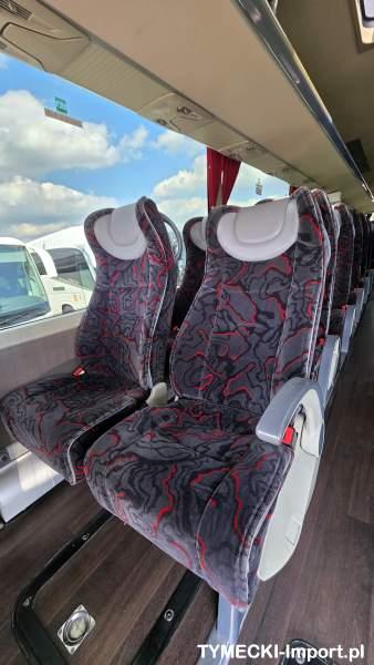 : video, WC, lodówka, kabina sypialna, oświetlenie indywidualne, nawiewy dyszowe, siateczki, ABS, ASR, tempomat, retarder, nawigacja, CD, podnóżki, stoliczki, mikrofon, klimatyzacja, radio, regulacja wysokości nadwozia, podwójne szyby boczne, wspomaganie kierownicy, elektryczne lusterka, fotele odchylane i rozsuwane, DVD, ogrzewanie stacjonarne, ESP