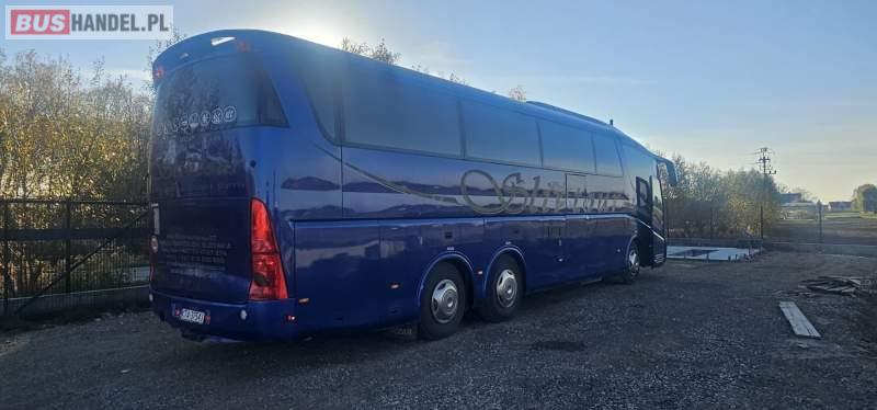 : video, WC, lodówka, caffebar, kabina sypialna, oświetlenie indywidualne, nawiewy dyszowe, siateczki, ABS, ASR, tempomat, retarder, telefon, nawigacja, CD, podnóżki, stoliczki, mikrofon, klimatyzacja, radio, sejf, regulacja wysokości nadwozia, centralny zamek, podwójne szyby boczne, wspomaganie kierownicy, elektryczne lusterka, fotele odchylane i rozsuwane, DVD, ogrzewanie stacjonarne, hak holowniczy, ESP