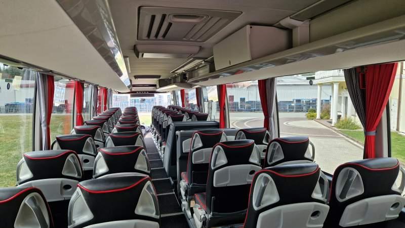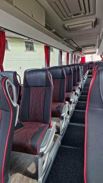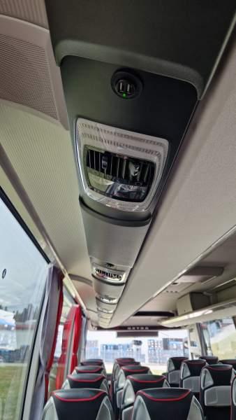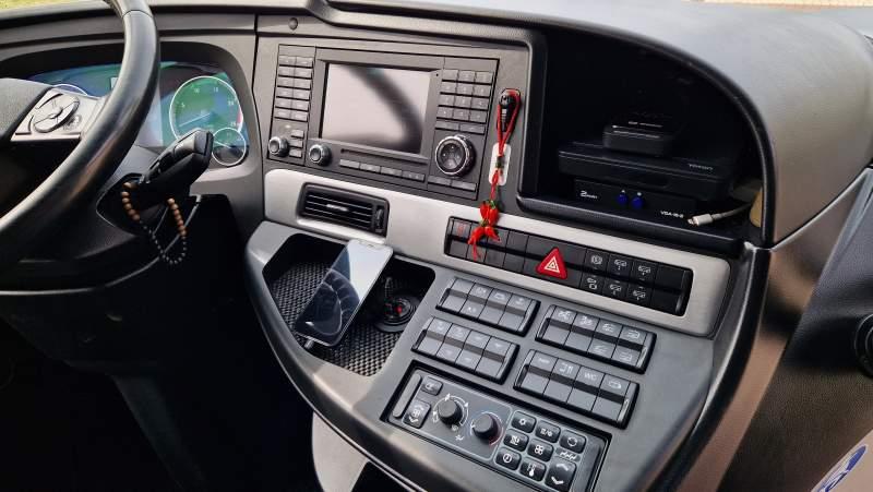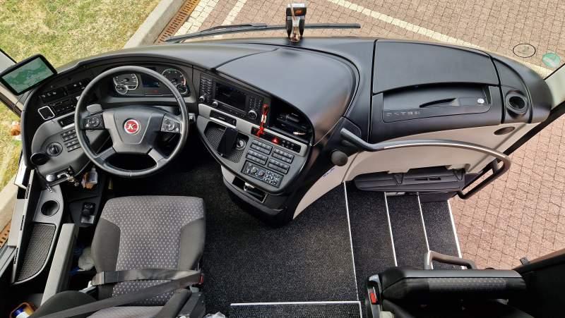 : video, WC, lodówka, caffebar, kabina sypialna, fotele odchylane, oświetlenie indywidualne, nawiewy dyszowe, siateczki, ABS, ASR, tempomat, retarder, telefon, nawigacja, CD, podnóżki, stoliczki, mikrofon, klimatyzacja, radio, regulacja wysokości nadwozia, centralny zamek, podwójne szyby boczne, wspomaganie kierownicy, elektryczne lusterka, fotele odchylane i rozsuwane, DVD, ogrzewanie stacjonarne, hak holowniczy, ESP