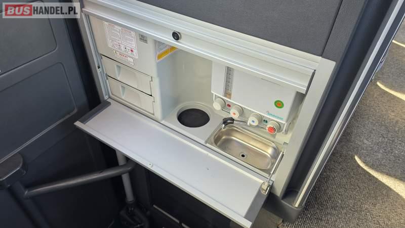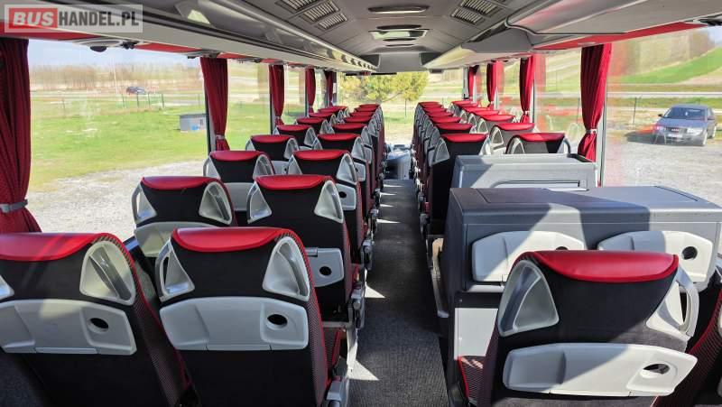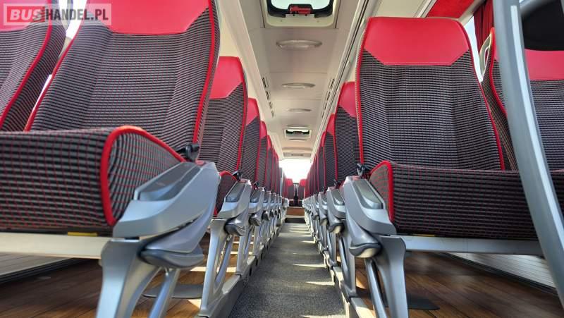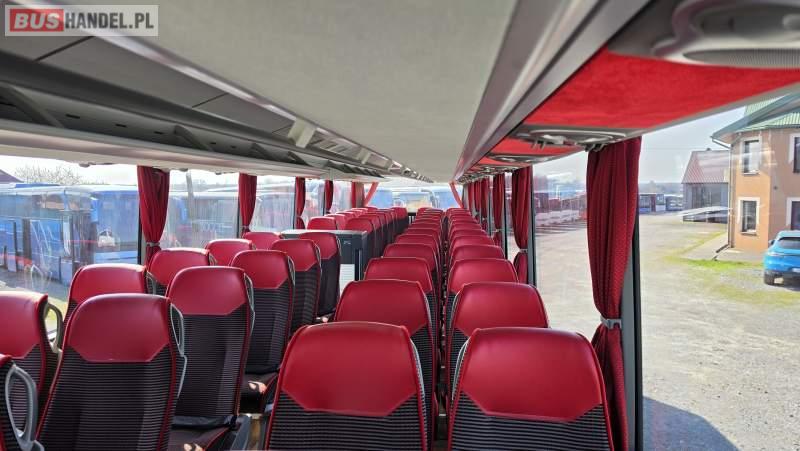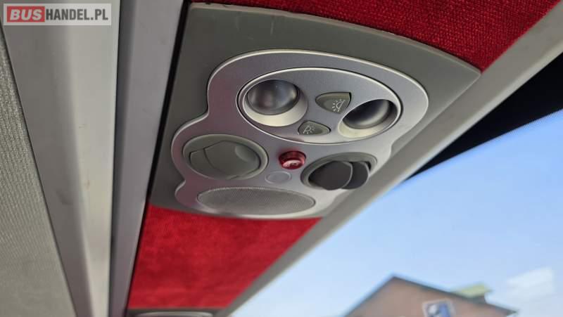 : video, WC, lodówka, caffebar, kabina sypialna, oświetlenie indywidualne, nawiewy dyszowe, siateczki, ABS, ASR, tempomat, retarder, CD, podnóżki, stoliczki, mikrofon, klimatyzacja, radio, sejf, regulacja wysokości nadwozia, centralny zamek, podwójne szyby boczne, wspomaganie kierownicy, elektryczne lusterka, aluminiowe felgi, fotele odchylane i rozsuwane, DVD, ogrzewanie stacjonarne, ESP