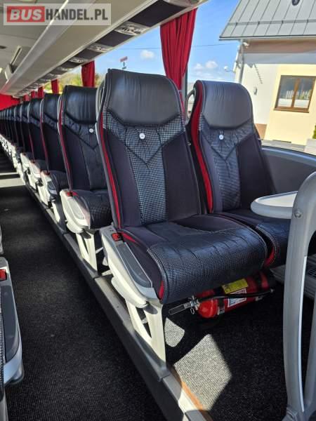 : WC, lodówka, caffebar, kabina sypialna, fotele odchylane, oświetlenie indywidualne, nawiewy dyszowe, siateczki, ABS, ASR, tempomat, retarder, podnóżki, stoliczki, mikrofon, klimatyzacja, radio, sejf, regulacja wysokości nadwozia, centralny zamek, podwójne szyby boczne, wspomaganie kierownicy, elektryczne lusterka, fotele odchylane i rozsuwane, DVD, ogrzewanie stacjonarne, ESP